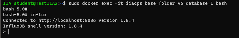 Una vez levantados los contenedores, será necesario generar una base de datos dentro del contenedor que ejecuta el software InfluxDB. Para hacerlo, entraréis al terminal dedicado del contenedor y accederéis a la interfaz de línea de comandos de InfluxDB.
