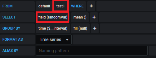 Haced clic en Add new panel y se os abrirá un panel que se va a ir actualizando con la información que añadáis en la pestaña Query. Ahora deberéis modificar los campos destacados en la captura con el nombre de la serie de medidas de InfluxDB donde habéis escrito los datos y la variable que contiene los valores numéricos de las medidas.