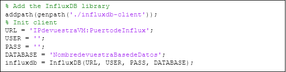 La primera sección del script sirve para conectarse a la base de datos. Completad los datos de vuestra base de datos de InfluxDB para que el script de MATLAB sea capaz de conectarse con ella.