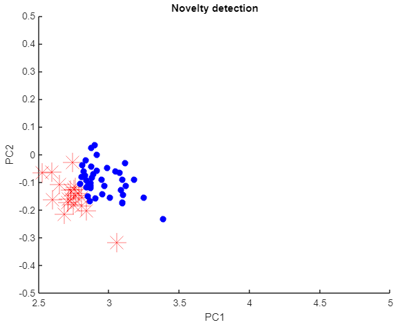 En este punto veréis como se crea una figura en MATLAB similar a las siguiente, que muestra la distribución de los datos y colorea en azul los datos clasificados como conocidos, y en rojo como los desconocidos.