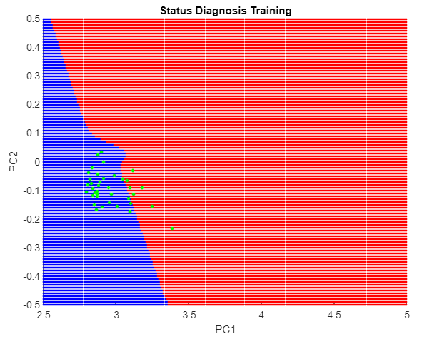 En esta sección, se realiza un diagnóstico con los datos clasificados como conocidos. En este punto veréis como se genera una malla de puntos en rojo y azul. Aquí, estos colores definen el dominio en el que la red neuronal considera que un dato pertenece a la condición de “Sano” (en el caso del color azul) o “Fallo cojinete” (en el caso del color rojo). Las entradas de datos se muestran como puntos verdes en la figura que os aparecerá, que debería ser similar a la siguiente.