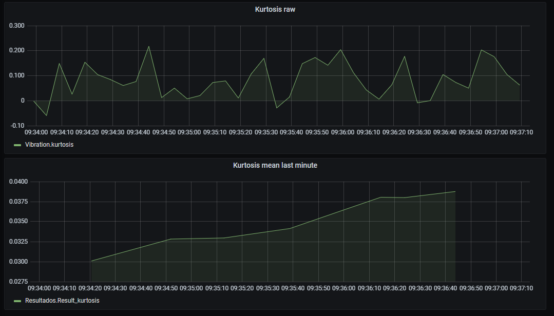 El primero con los datos medidos del parámetro Kurtosis, que tiene un valor nuevo cada 5 segundos. Recordad que ello corresponde a que el flow de Node-RED solo escribe en la base de datos cada vez que lee un dato nuevo en el PLC.