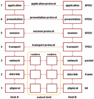 La figura siguiente muestra un esquema de comunicaciones entre dos equipos (Host A y Host B) y la correspondencia de protocolos para cada capa. Las anotaciones a la derecha (APDU, PPDU, SPDU, etc.) indican que nombre reciben las unidades de comunicación en cada capa.