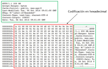 Las peticiones y respuestas HTTP se codifican como una string en formato ASCII, lo que permite que los datos se envíen en forma de trama codificada en formato hexadecimal. A continuación, podéis ver un ejemplo de respuesta HTTP y su equivalencia como una trama de datos hexadecimal: