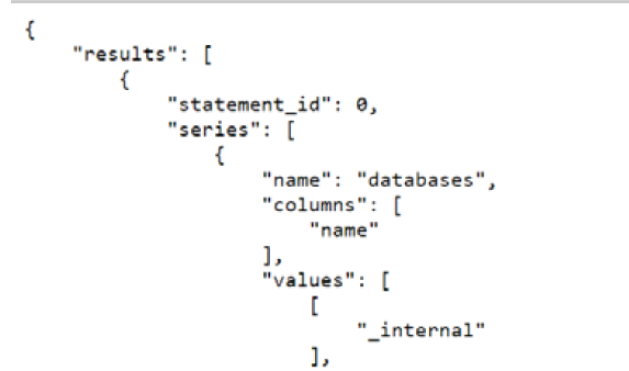 The following HTTP address example makes a GET request to the “endpoint” query, with the “q” and “pretty” parameters. According to the InfluxDB API, the “q” parameter must contain the command that we want to execute, in this case “SHOW DATABASES”, and the “pretty” parameter contains a boolean to indicate that the response is with easy-to-view line breaks.