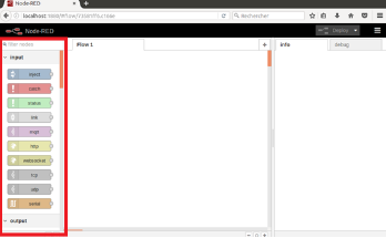 In Node-RED, a communication flow or flow is a .JSON file where one or more data flows have been programmed. These flows are created by dragging the desired nodes from the side palette (highlighted in red in the following screenshot) to the workspace, where they can be connected to each other and configured with parameters and attributes specific to each node.